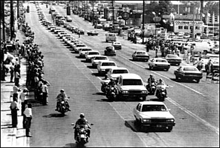 Ein langer Autocorso (mit dem Leichenwagen mit Elvis Presleys
